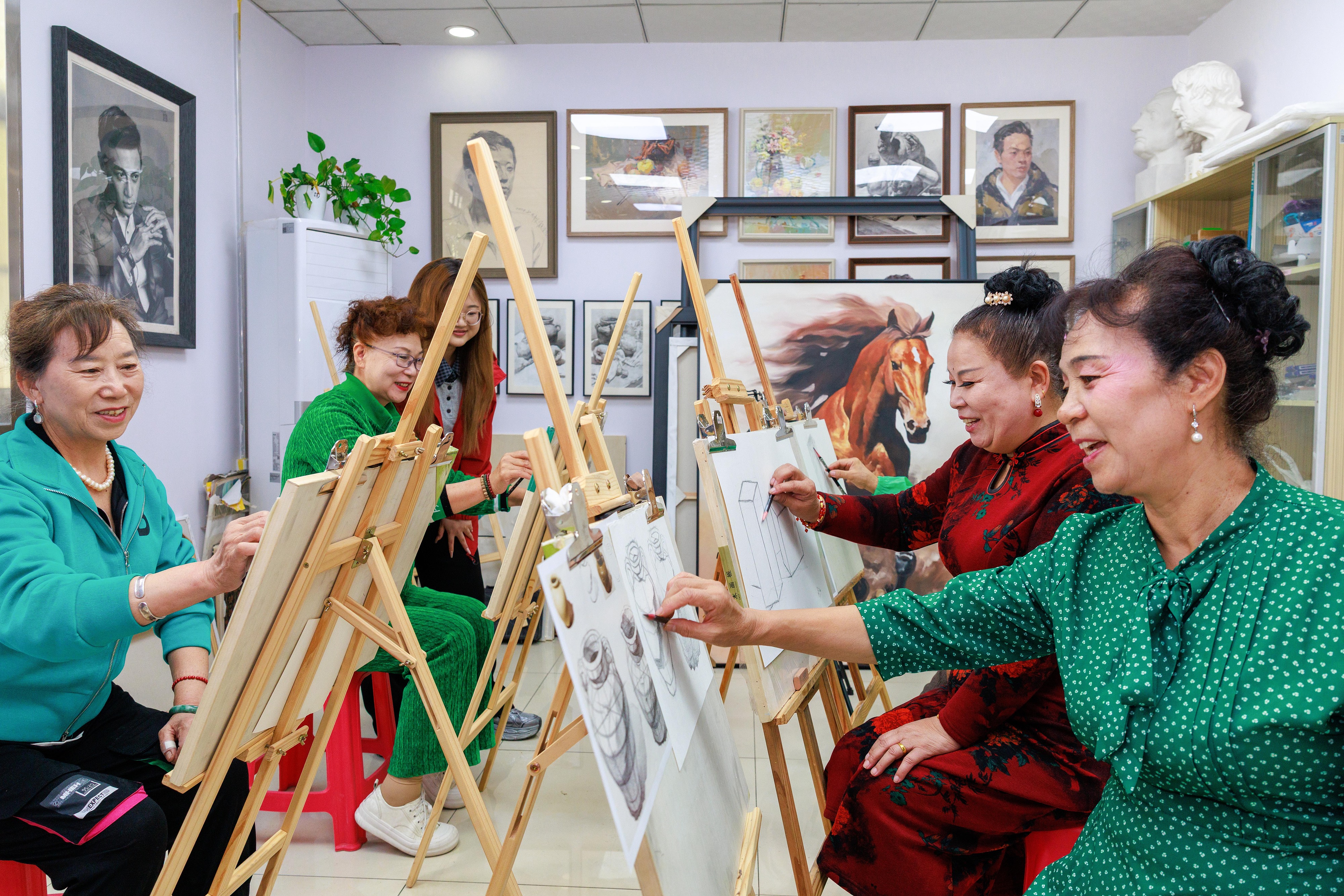 2025年9月16日,新疆乌鲁木齐中亚南路街道白石桥社区,老人们正在学习绘画。